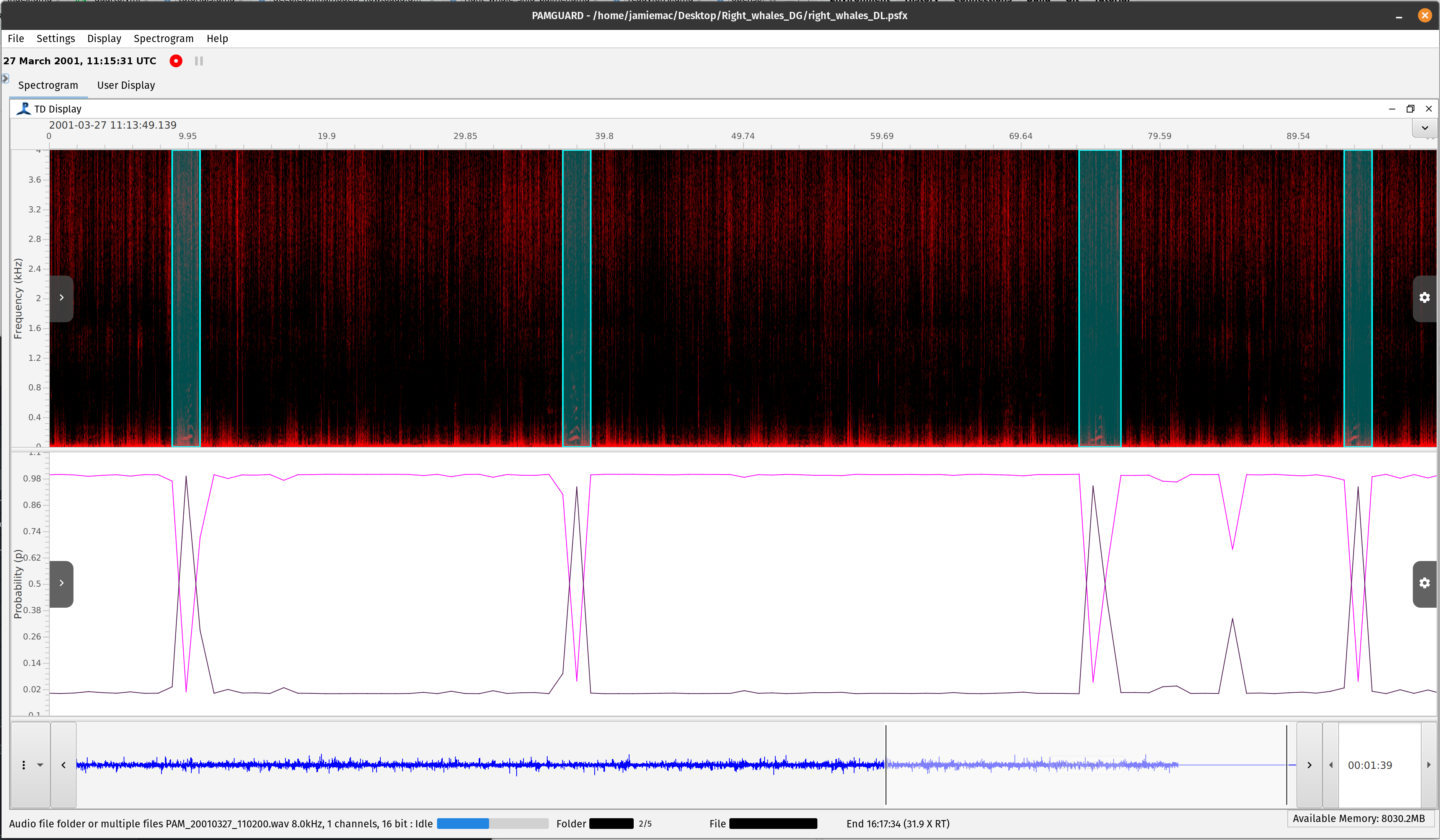 This is a spectrogram based model for detecting right whale up-sweeps developed by Shiu and Palmer et al. (2020). The model was tested on a standardised dataset from the DCLDE conference in 2013 (Detection, Classification, Localisation, and Density Estimation)to quantify the performance compared to other leading automated analysis approaches. Shiu/Palmer et al.’s 2020 deep learning approach outperformed all those efforts by a very wide margin (see Figure 1 in their paper) and was an early demonstration of the potential of deep learning approached in marine bioacoustics.