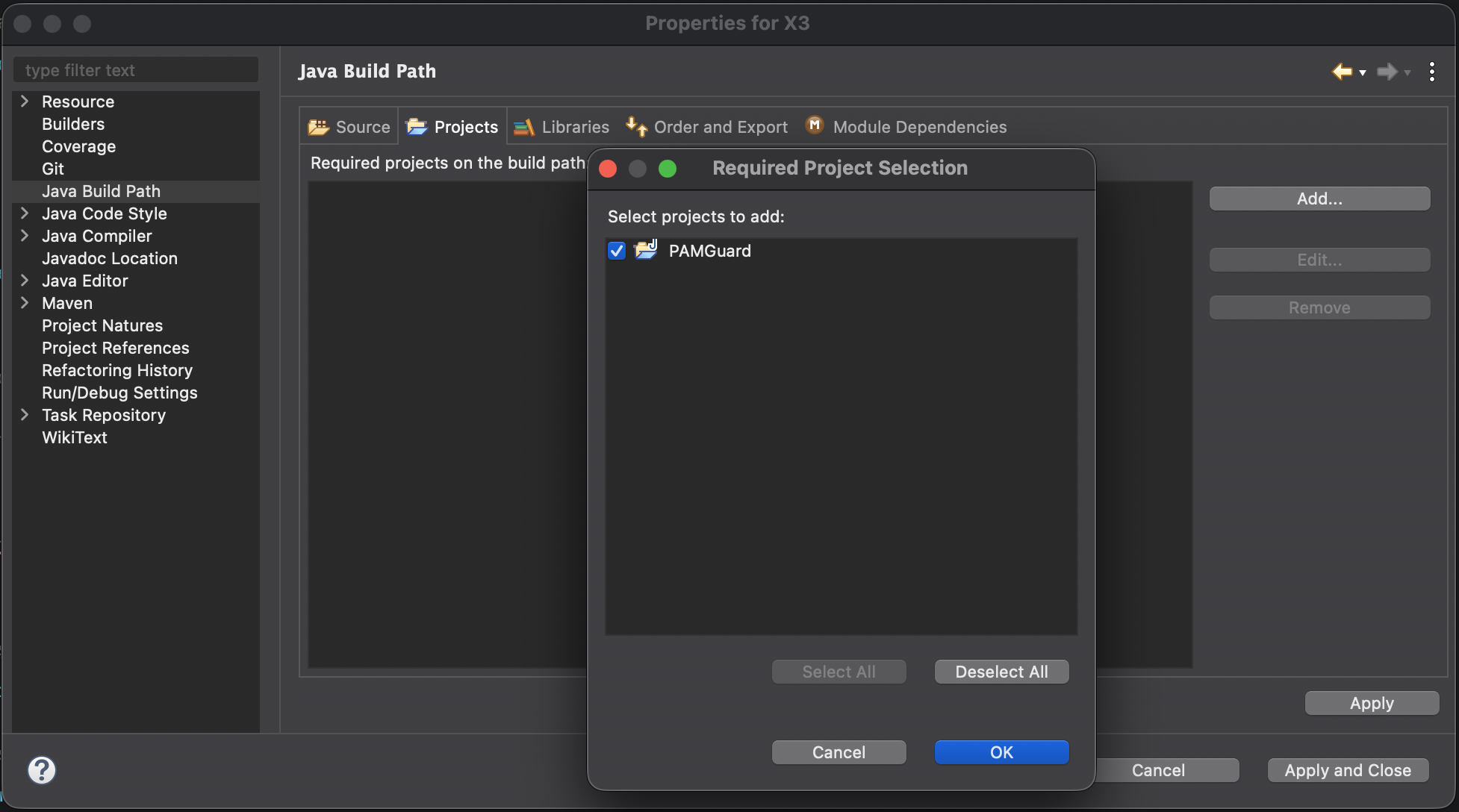 } If you have external dependencies, you will need to build as a Maven project. Maven does not consider Eclipse build settings and so the build will fail unless you add PAMGuard as dependency. In your pom.xml add PAMGuard as a dependency as follows.