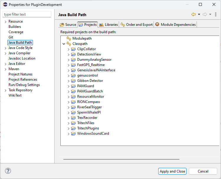 Now your plugin project will know all the classes in PAMGuard and you can start developing your plugin module. There are multiple types of plugins and each has an example project which you can use as a starting point.